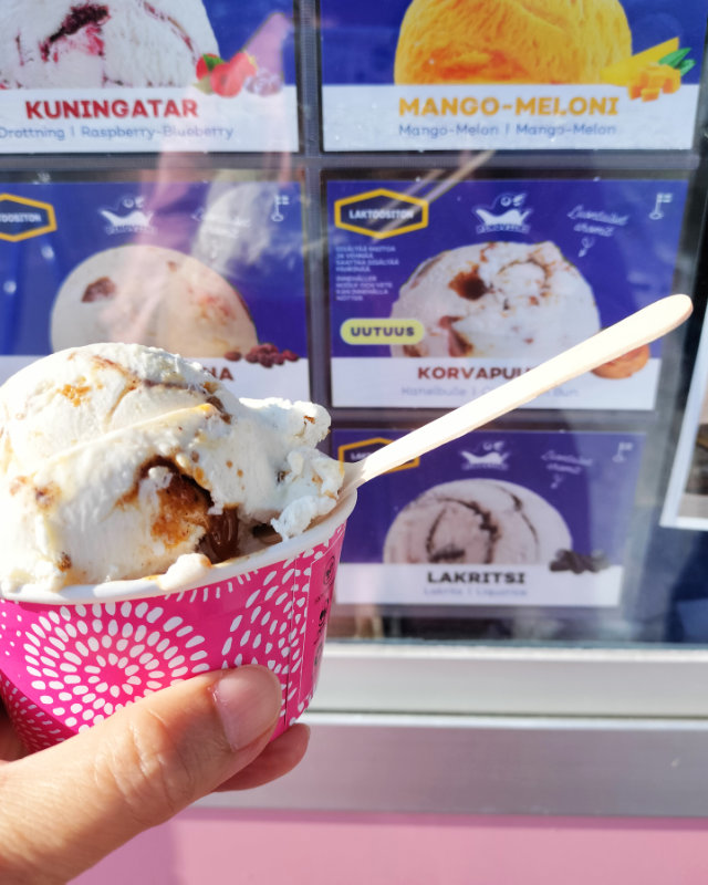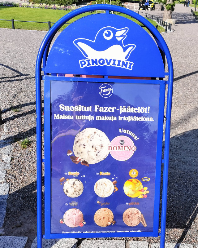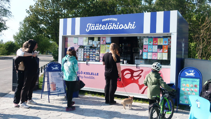公園の前でアイスクリームの屋台を発見。フィンランド人のアイス好きは有名で、イチャイチャしているカップルや家族連れ、犬の散歩やサイクリング途中の人たちが次々と列に並んでいます。