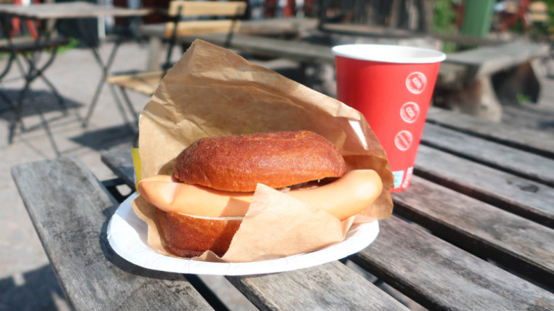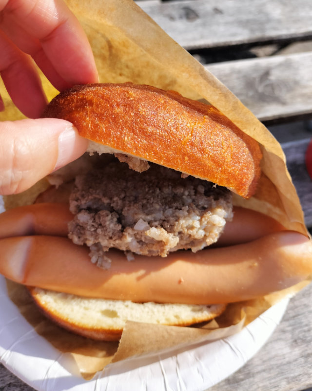 というわけで、同じくエロマンガのサーモンパイ(ロヒピーラッカ)にも惹かれつつ、今回はエロマンガ版のリハピーラッカに決定。揚げパンの中に挽き肉が挟まれ、さらにソーセージが2本入ったボリューム満点の一品でした。