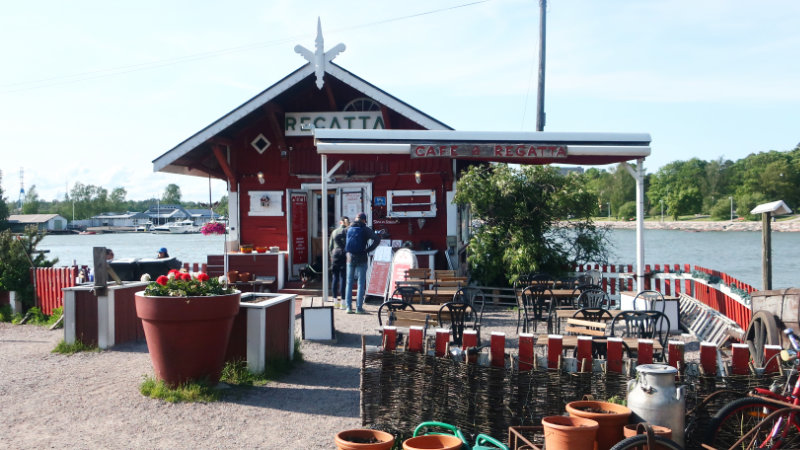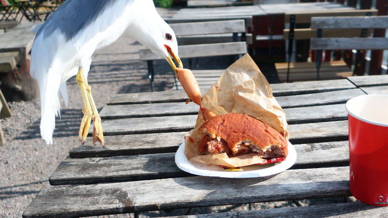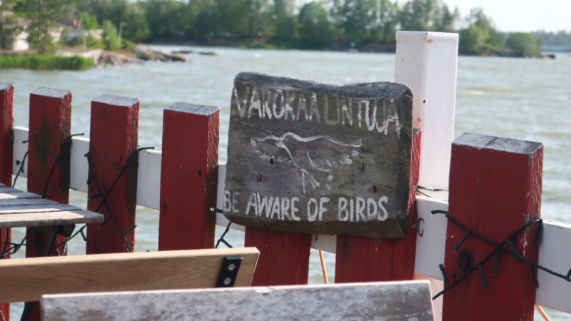 横を見ると「鳥に注意」の看板。「かもめ食堂」ならぬ「かもめの食堂」!これだけ食べたらかもめも腹パンだろう。あとでフィンランドに人に話すと「あるある」だって。