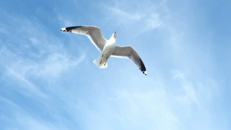 なんだか落ち着くなあとカモメの行方をカメラで追いながら撮っていると、そのカモメがふわーと音もなく降りてきて、私のリハピーラッカのソーセージを2本とも咥えて飛び去った!