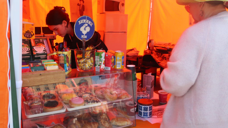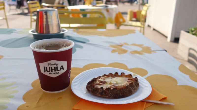 まずはテント屋台でカルヤランピーラッカ(カレリアパイ)と温かいコーヒーで腹ごしらえ。少し冷たい朝の空気の中、フィンランド旅のはじまりにぴったりの朝ごはんです。