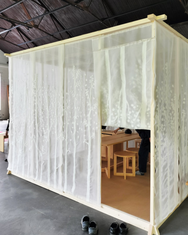 ルツ子さんの展示は、日本の茶室をイメージした空間。木で組まれた箱に、壁としてルツ子さんがフェルトで描いたフィンランドの森の布が静かに垂れ下がっています。