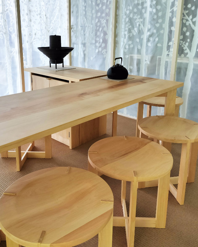 その中には、ルツ子さんのパートナーである家具作家、カリ・ヴィルタネンさんの椅子とテーブル。そして、すでに鉄瓶がひとつ置かれ、あとは訪問客を待つばかり。