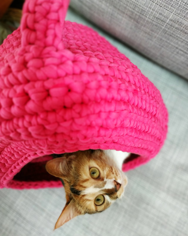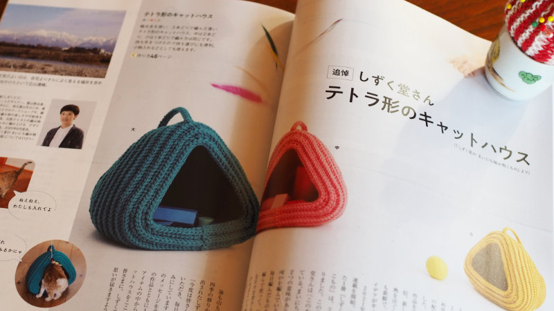 しずく堂さんが編んでくれたキャットハウスは、今も猫たちが愛用しています。三角形なのは同じですが、こちらは初期のデザインで、誌面に掲載されている作品は、より丈夫になった別バージョンです。