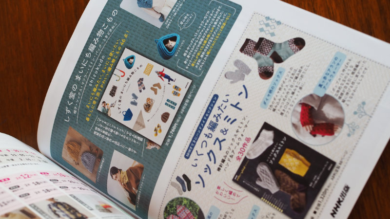 また、しずく堂さんがNHKで連載した作品をまとめた本『まいにち編み物こもの』の広告も掲載されていました。NHKさんからこの話が来た当時、しずく堂さんは治療が始まった頃で、「もしかしたら連載を続けられないかもしれない」と迷っている、と相談を受けました。
